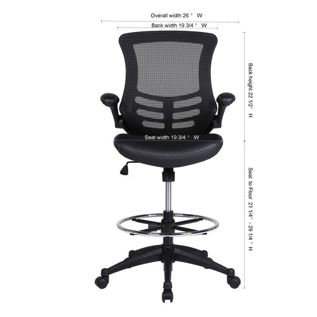 The Serene Collection task stool is designed for tasks and workspaces that require elevated seating while still providing dependable back support. Its flip-up arms help users work closer to surfaces or equipment, while the foot ring offers leg support and helps reduce fatigue during extended use. Finished in black bonded leather with mesh back and a coordinating black base, the stool combines comfort and practicality, making it well-suited for a variety of work environments.